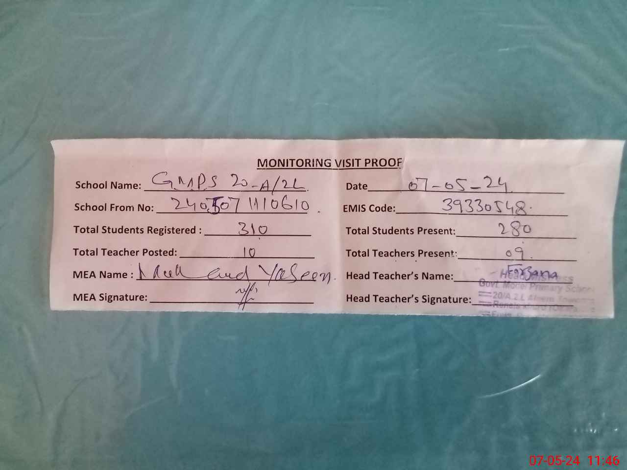 | EMIS Code: 39330548 | Name of School: GMPS 20 A-2L (ALEEM TOWN) | |||