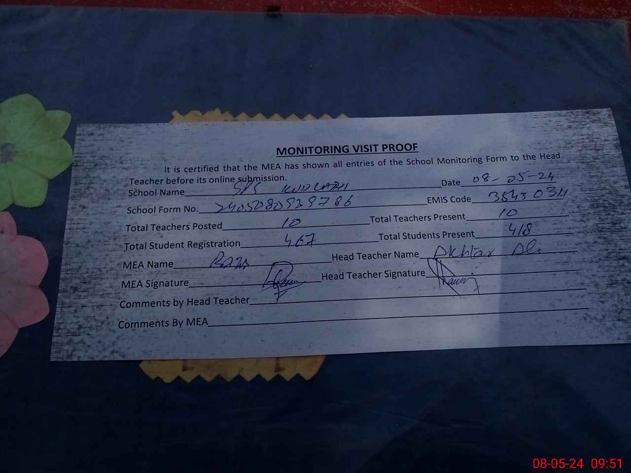 | Attendance Register | Head Teacher | MEA with School | Visit Proof |