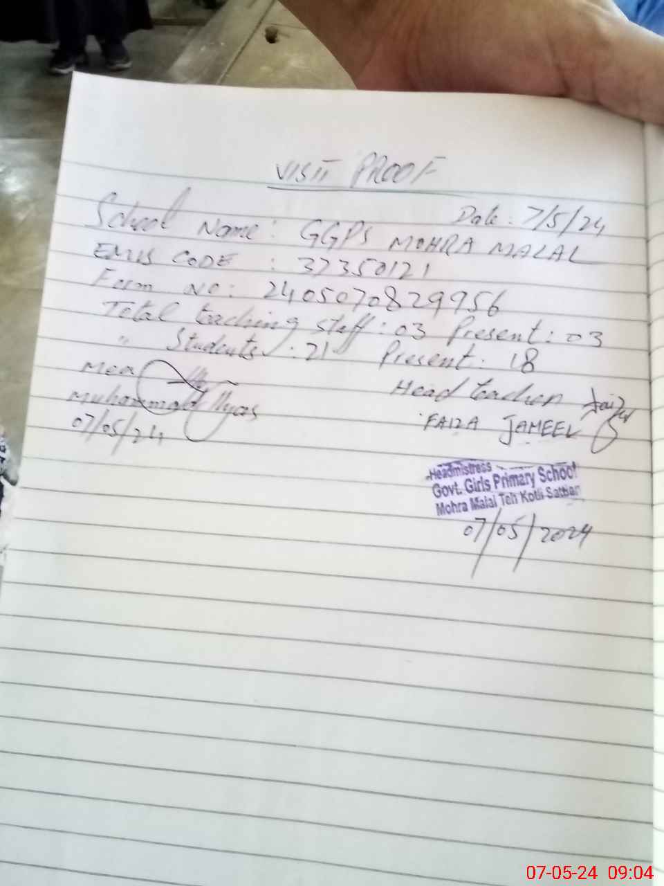 | Attendance Register | Head Teacher | MEA with School | Visit Proof |