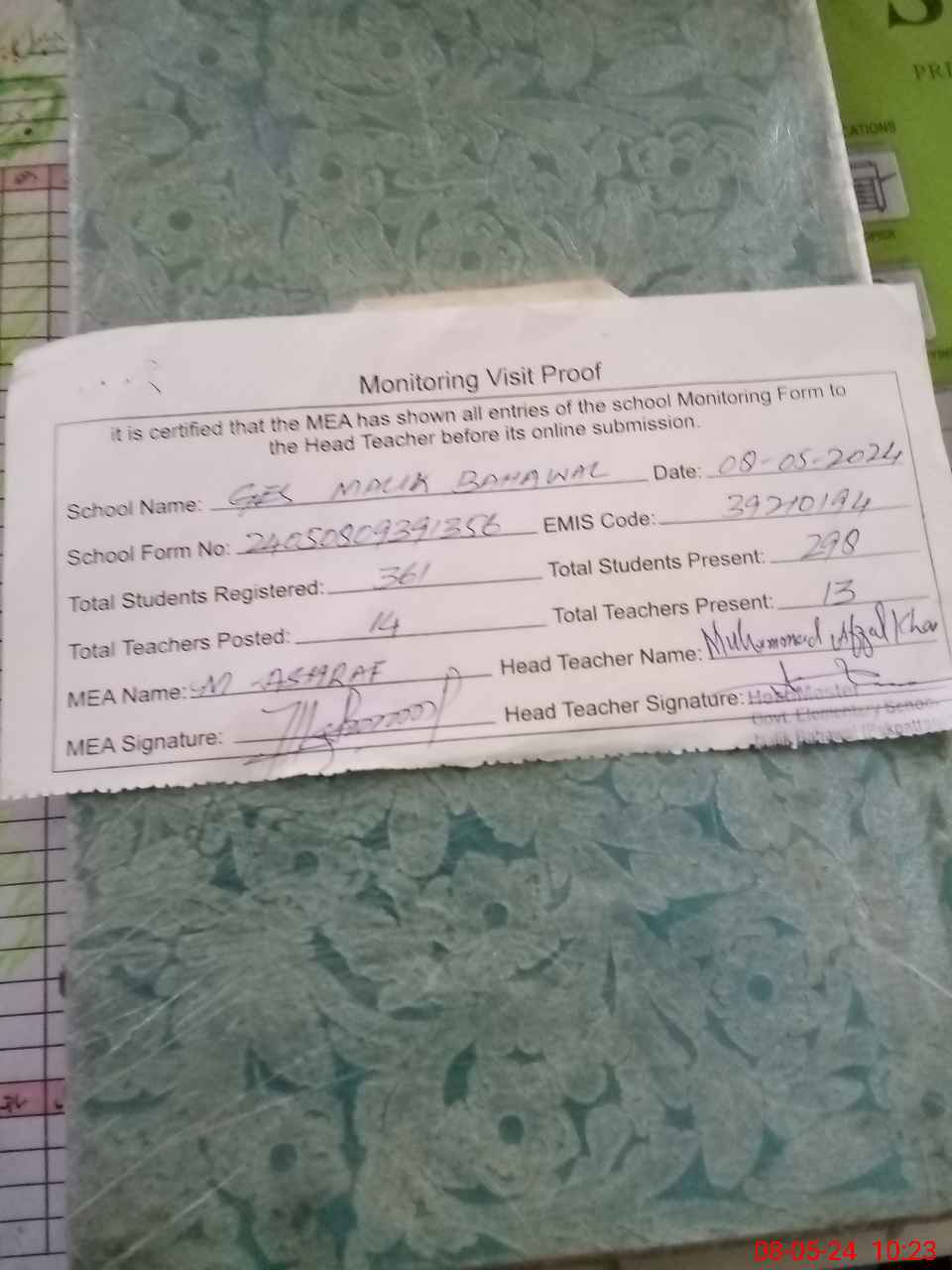 | Attendance Register | Head Teacher | MEA with School | Visit Proof |