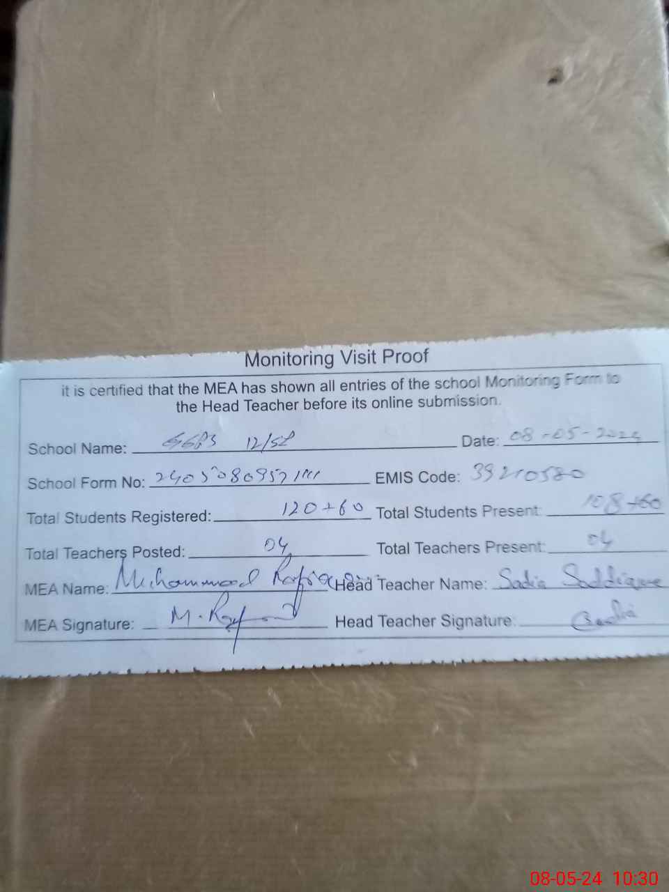 | Attendance Register | Head Teacher | MEA with School | Visit Proof |