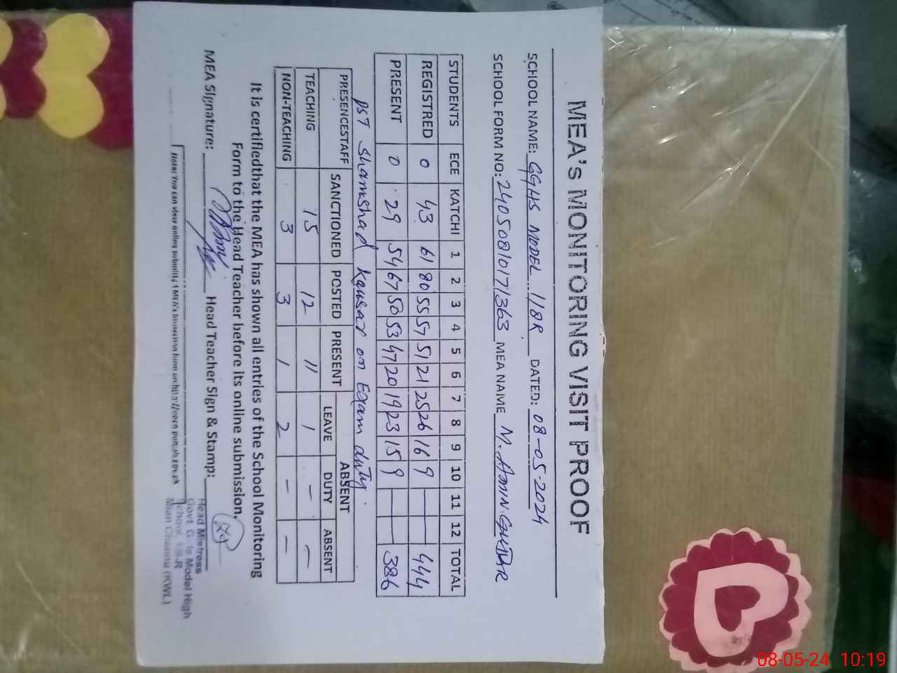 | Attendance Register | Head Teacher | MEA with School | Visit Proof |