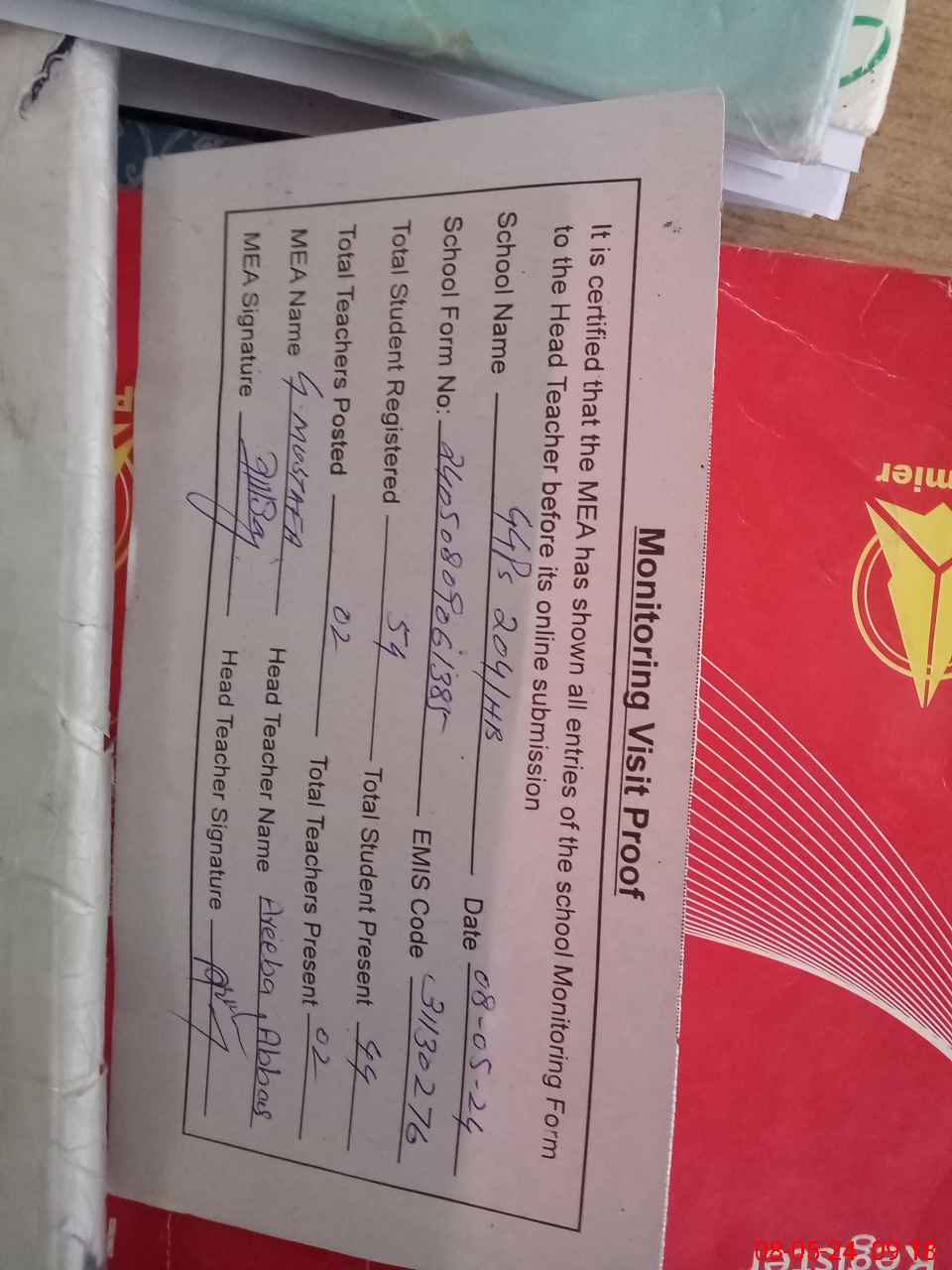 | Attendance Register | Head Teacher | MEA with School | Visit Proof |