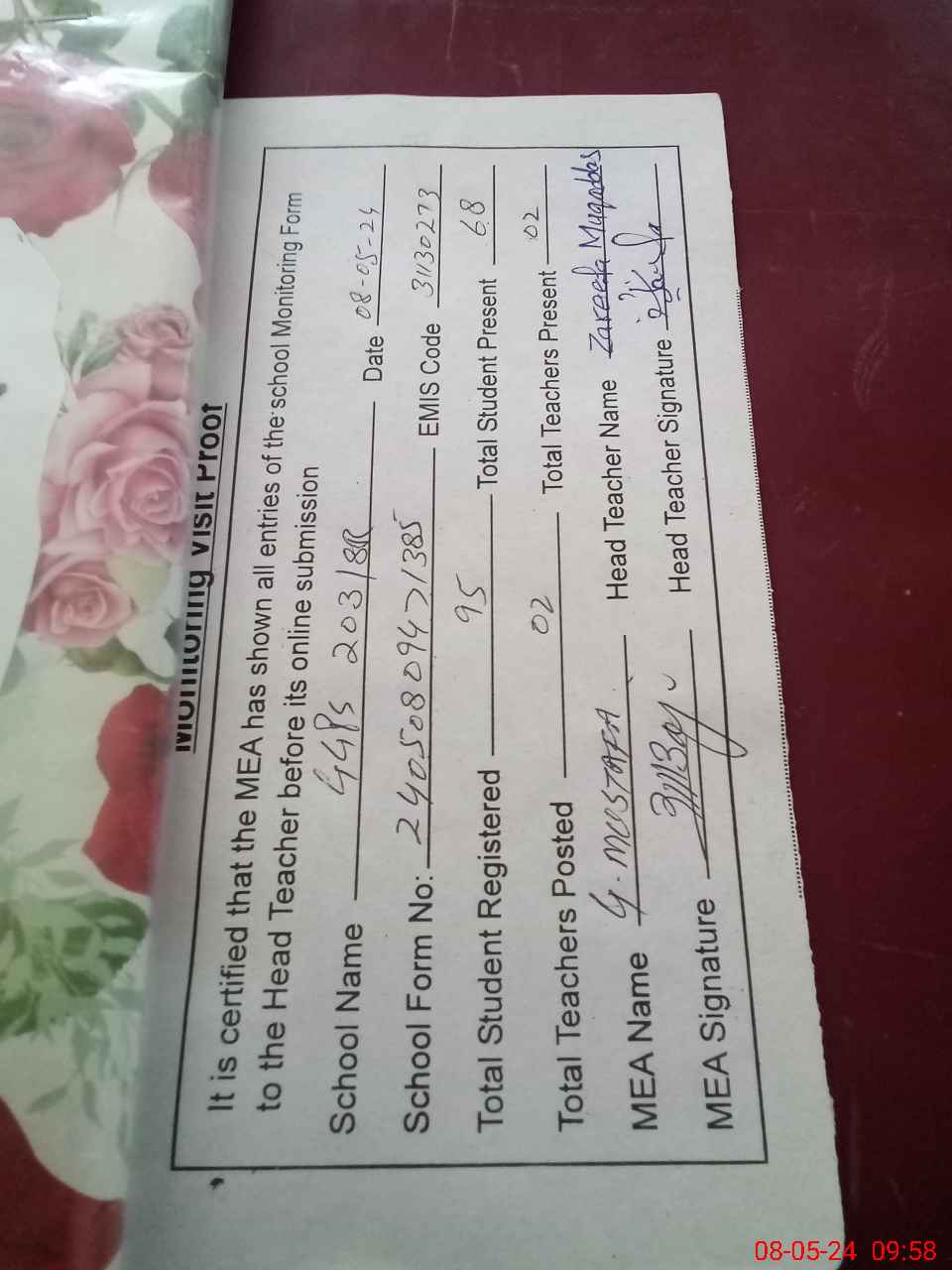 | Attendance Register | Head Teacher | MEA with School | Visit Proof |