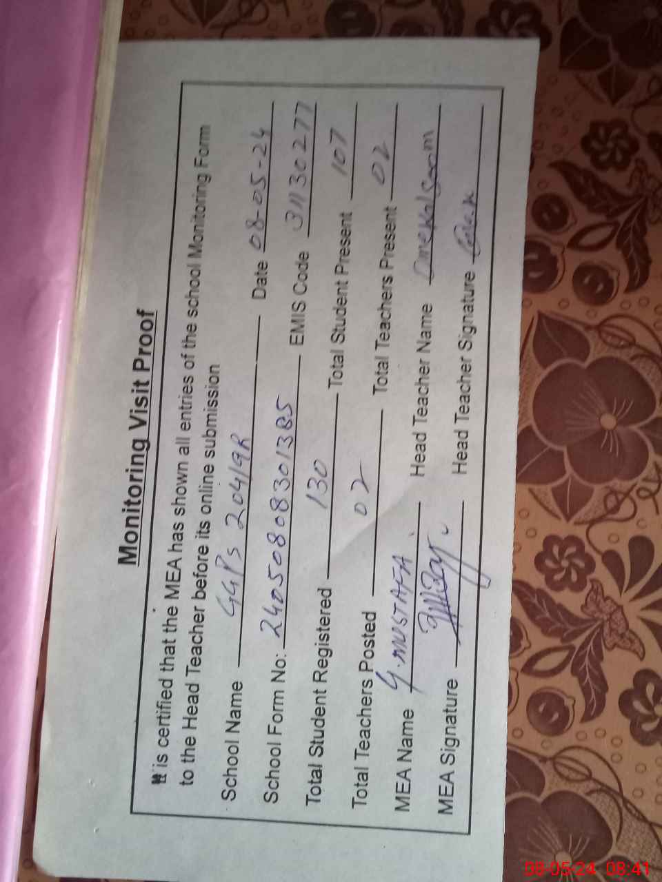 | Certified that this School was Inspected by the Undersigned MEA/DMO Today and the Information Stated Above is as Per Record. | |||||