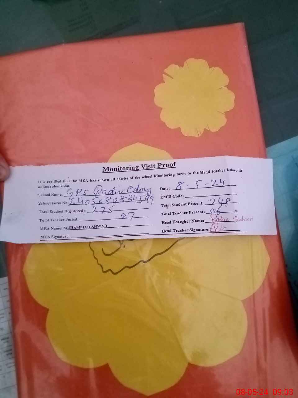 | Attendance Register | Head Teacher | MEA with School | Visit Proof |