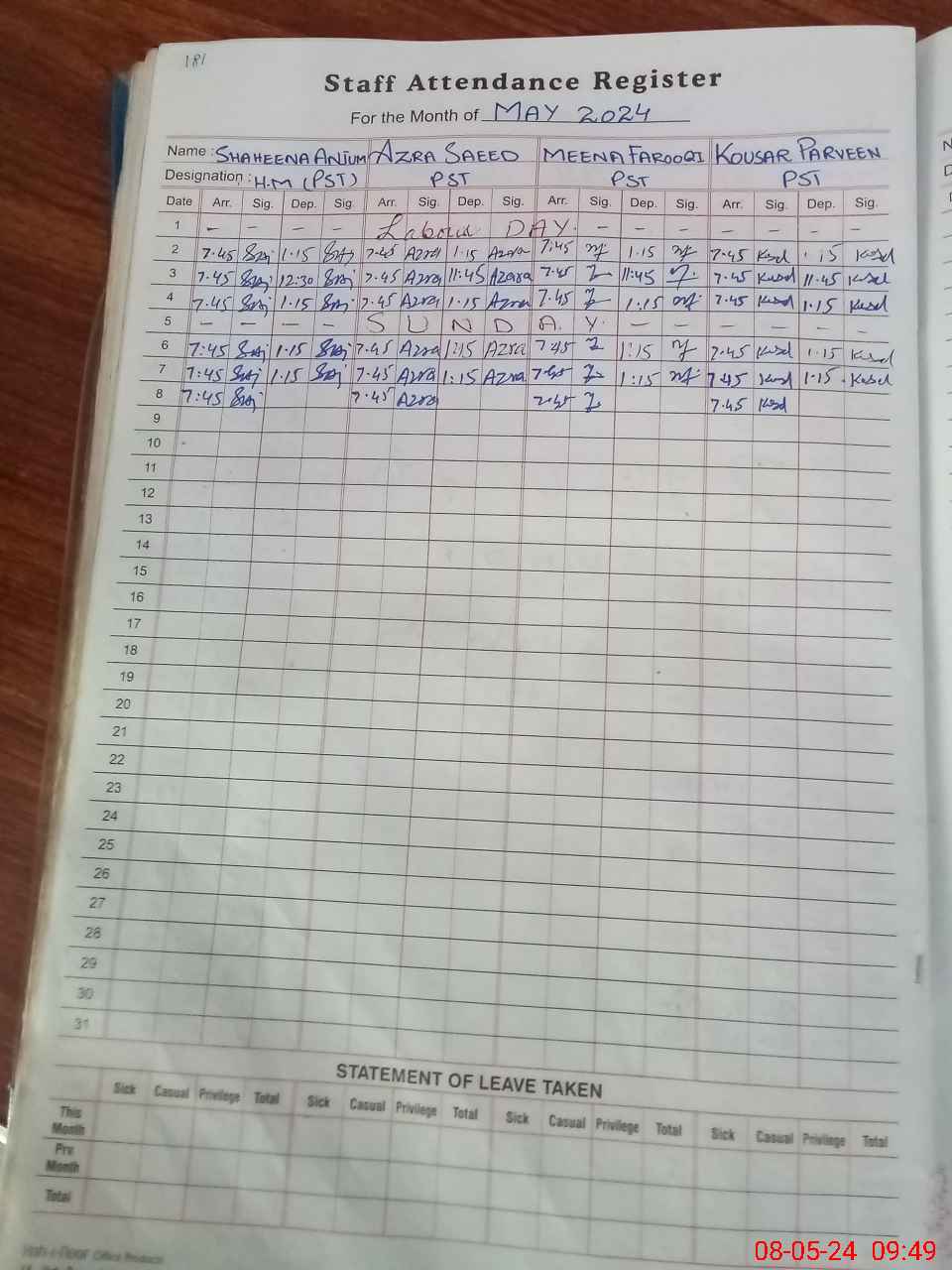 | Leave | Duty | Absent | Maternity | Medical | Ex- Pak |