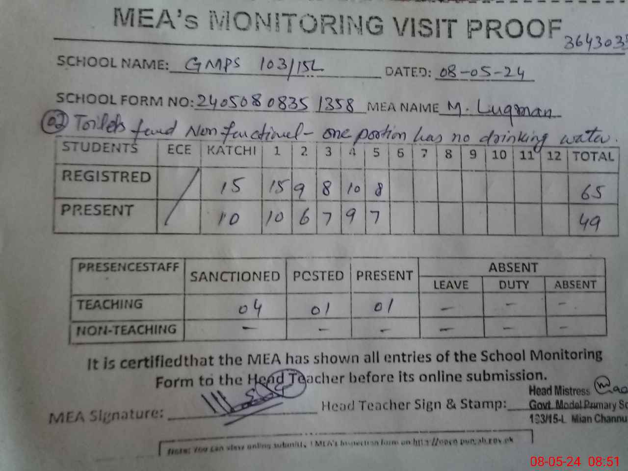 | Attendance Register | Head Teacher | MEA with School | Visit Proof |
