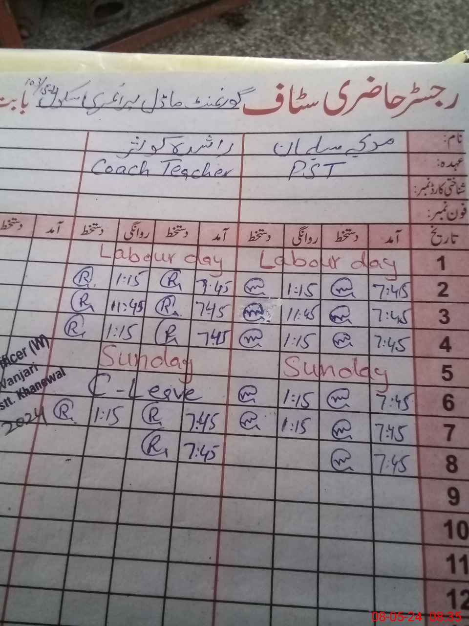 | CNIC | Full Name | Designation | R/C | Absence During Last Calender Month |