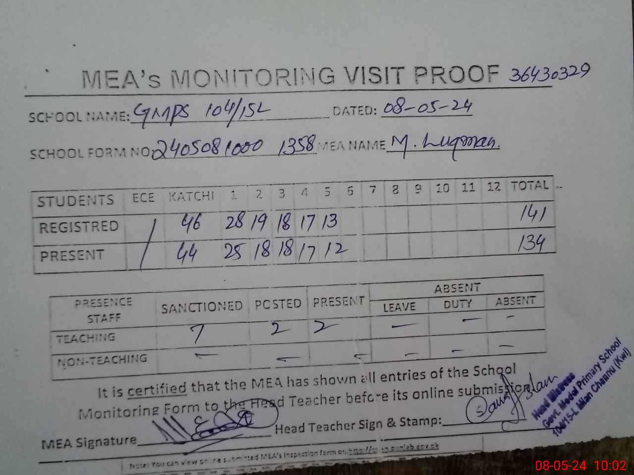 | Attendance Register | Head Teacher | MEA with School | Visit Proof |