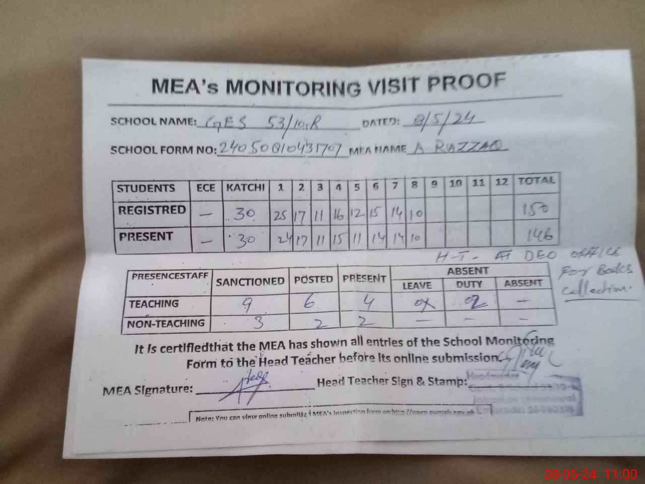 | Attendance Register | Head Teacher | MEA with School | Visit Proof |