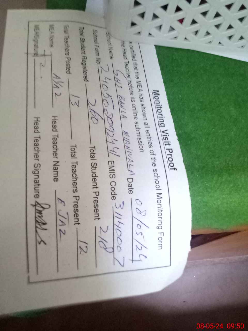 | Attendance Register | Head Teacher | MEA with School | Visit Proof |
