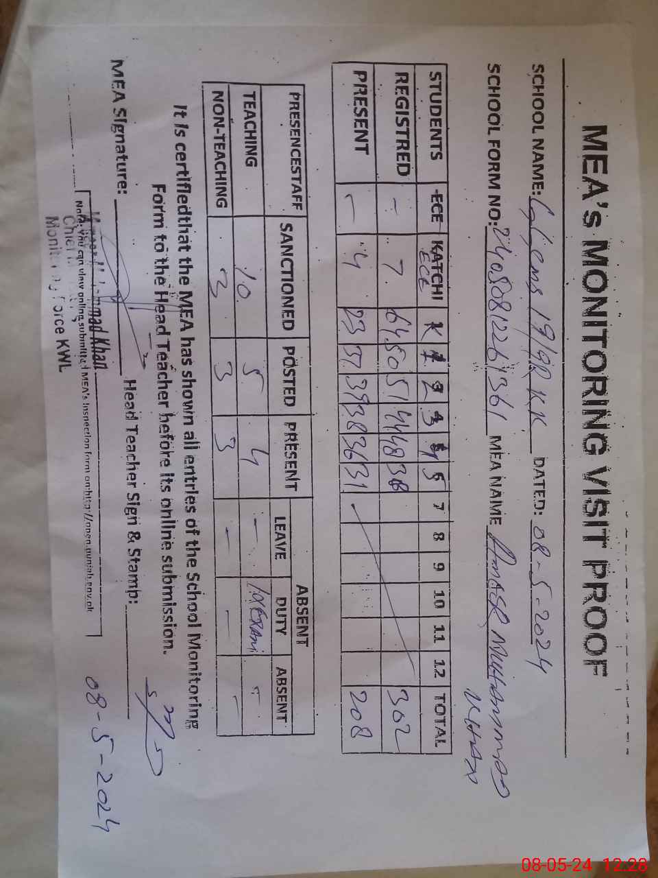 | Attendance Register | Head Teacher | MEA with School | Visit Proof |