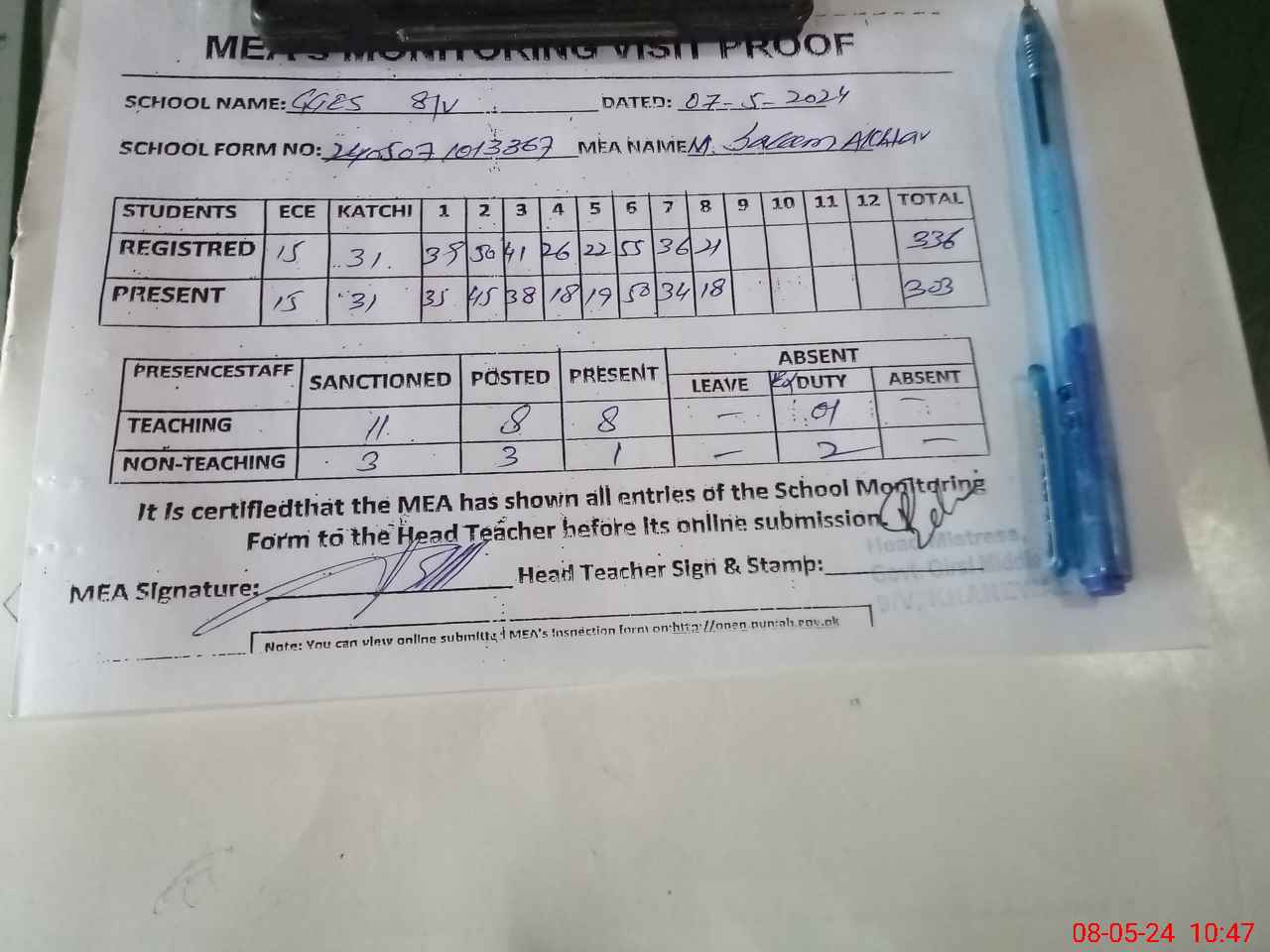 | Attendance Register | Head Teacher | MEA with School | Visit Proof |