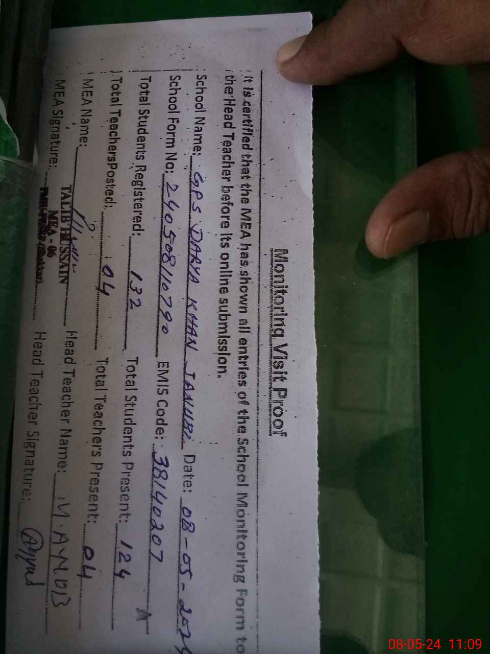 | Attendance Register | Head Teacher | MEA with School | Visit Proof |