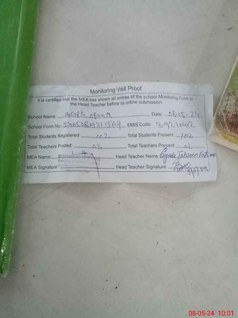 | Attendance Register | Head Teacher | MEA with School | Visit Proof |
