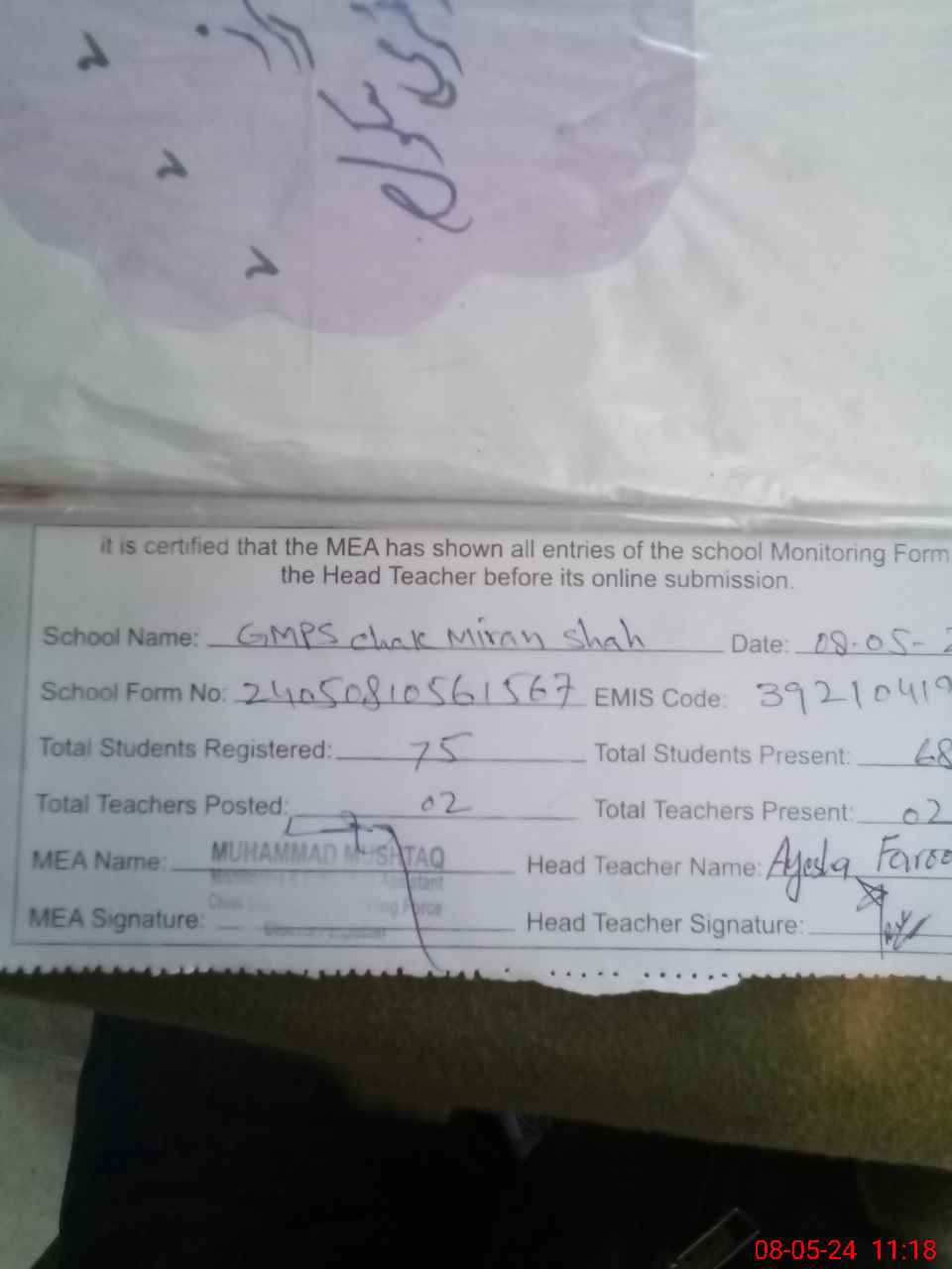 | Attendance Register | Head Teacher | MEA with School | Visit Proof |