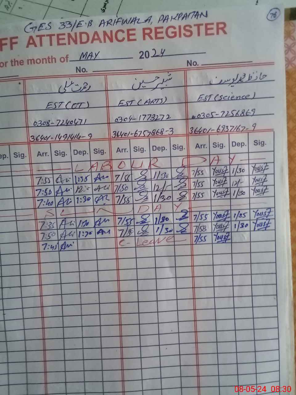| Name: RA**** AL**** Designation: (School Headmaster's/Headmistress's) EST (HM) Phone/Cell Number: 03**** |
