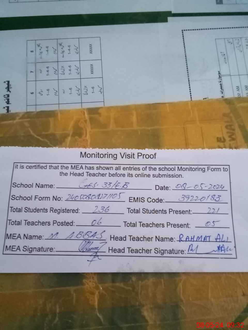 | Attendance Register | Head Teacher | MEA with School | Visit Proof |
