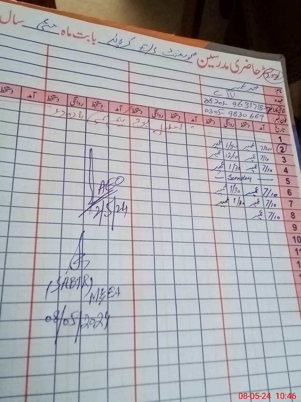 | Name: Uz**** Sa**** Designation: (School Headmaster's/Headmistress's) Est Incharge Phone/Cell Number: 03**** |