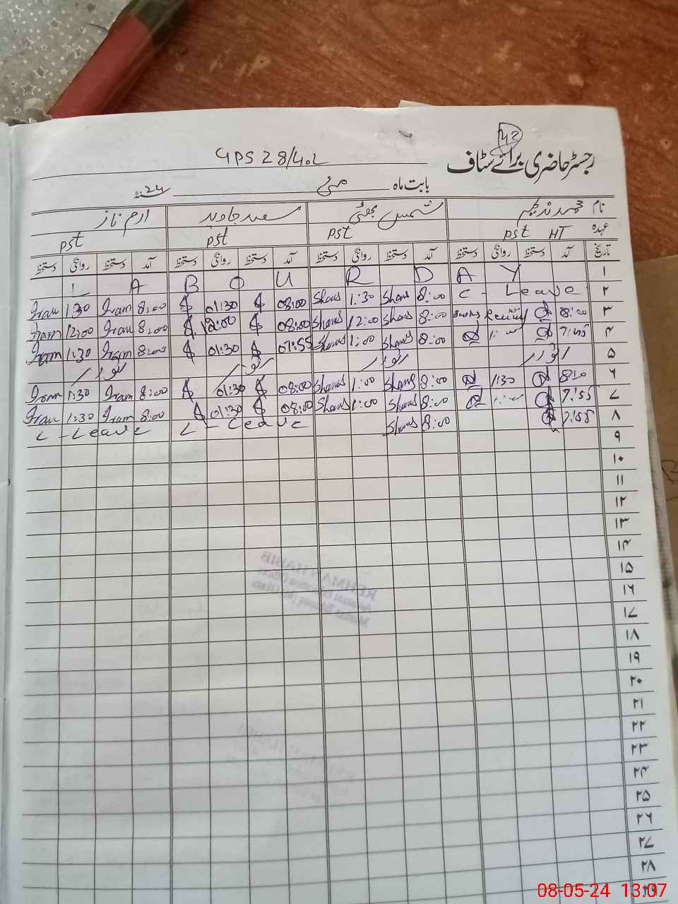 | 35**** | Ir**** Na**** | PST | Regular | 2 | 28 | 0 | 0 | 0 | 0 | 0 | 0 | 2 | Casual |