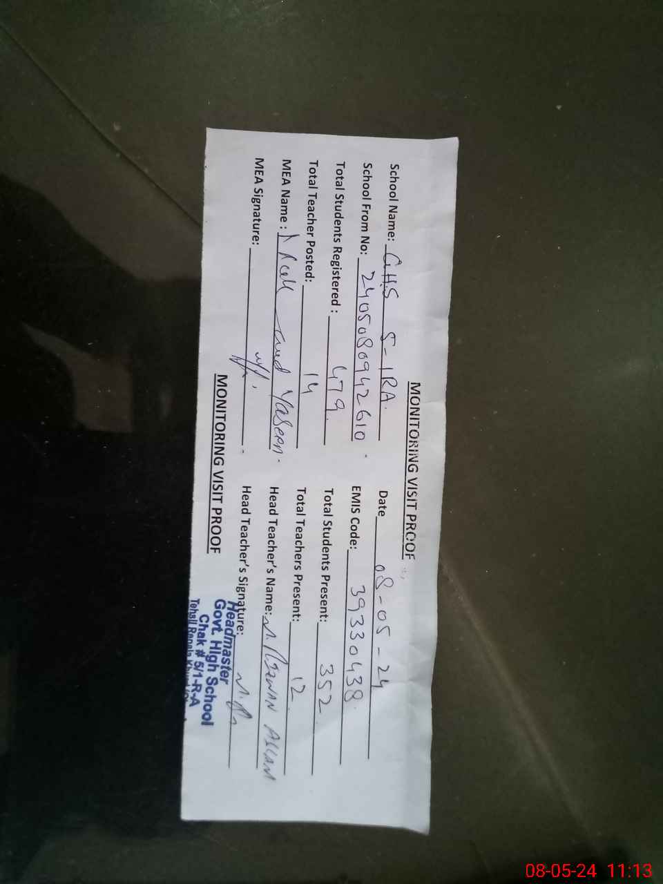 | EMIS Code: 39330438 | Name of School: GHS CHAK NO. 5/1-RA | |||