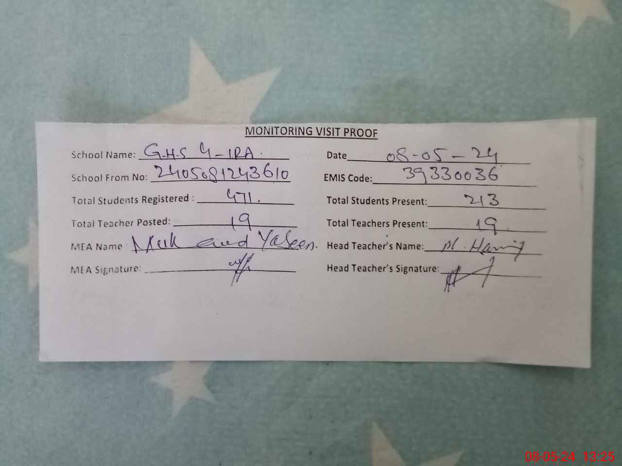 | Attendance Register | Head Teacher | MEA with School | Visit Proof |