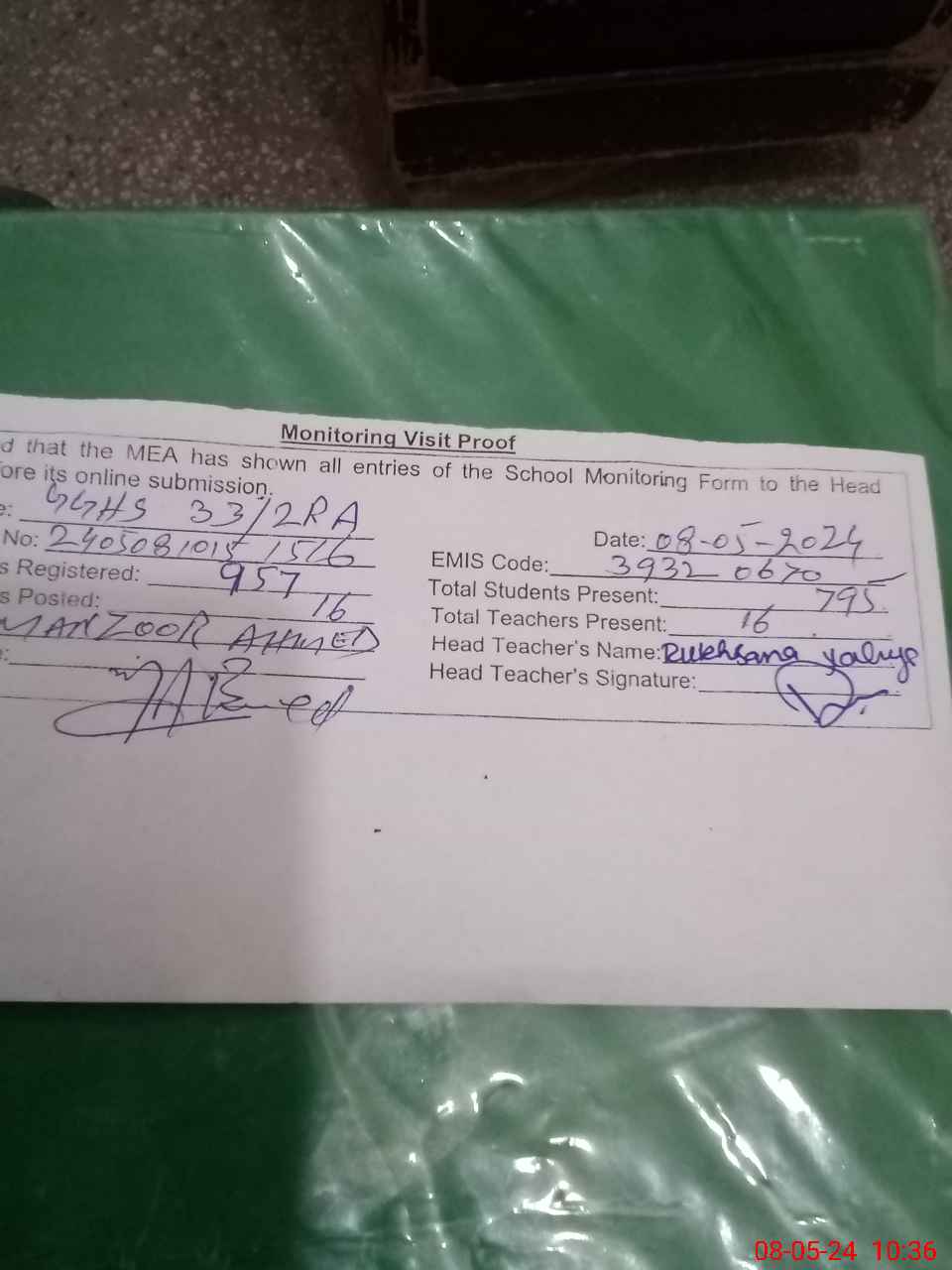 | Attendance Register | Head Teacher | MEA with School | Visit Proof |