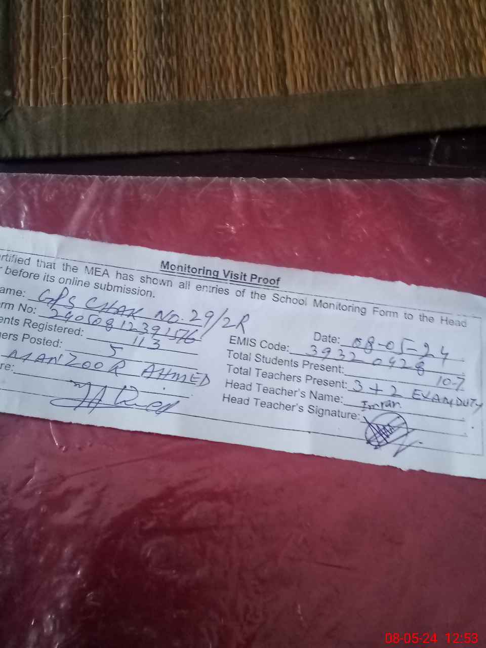 | Attendance Register | Head Teacher | MEA with School | Visit Proof |