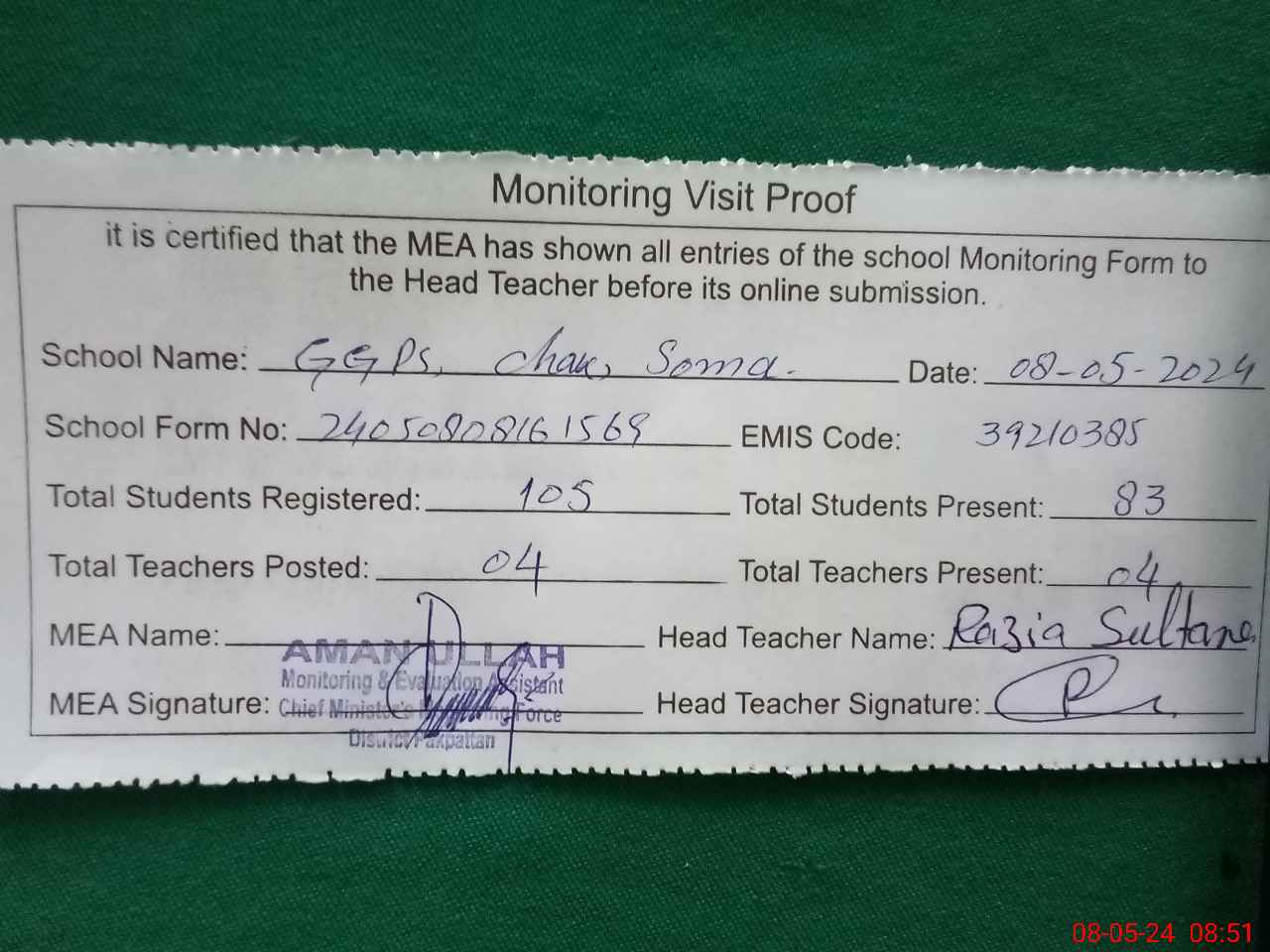 | Monitoring Date: 08-05-2024 | Start Time: 08-05-2024 08:16 AM | End Time: 08-05-2024 09:00 AM | Name of MEA: AM**** UL**** | |
