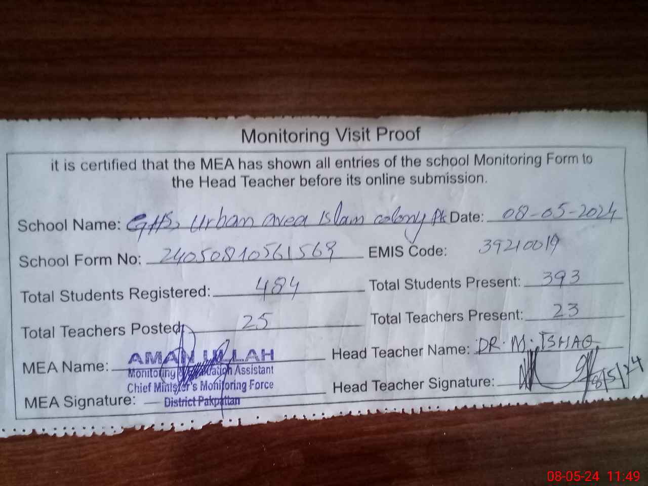 | EMIS Code: 39210019 | Name of School: GHS URBAN AREA ISLAM COLONY | |||