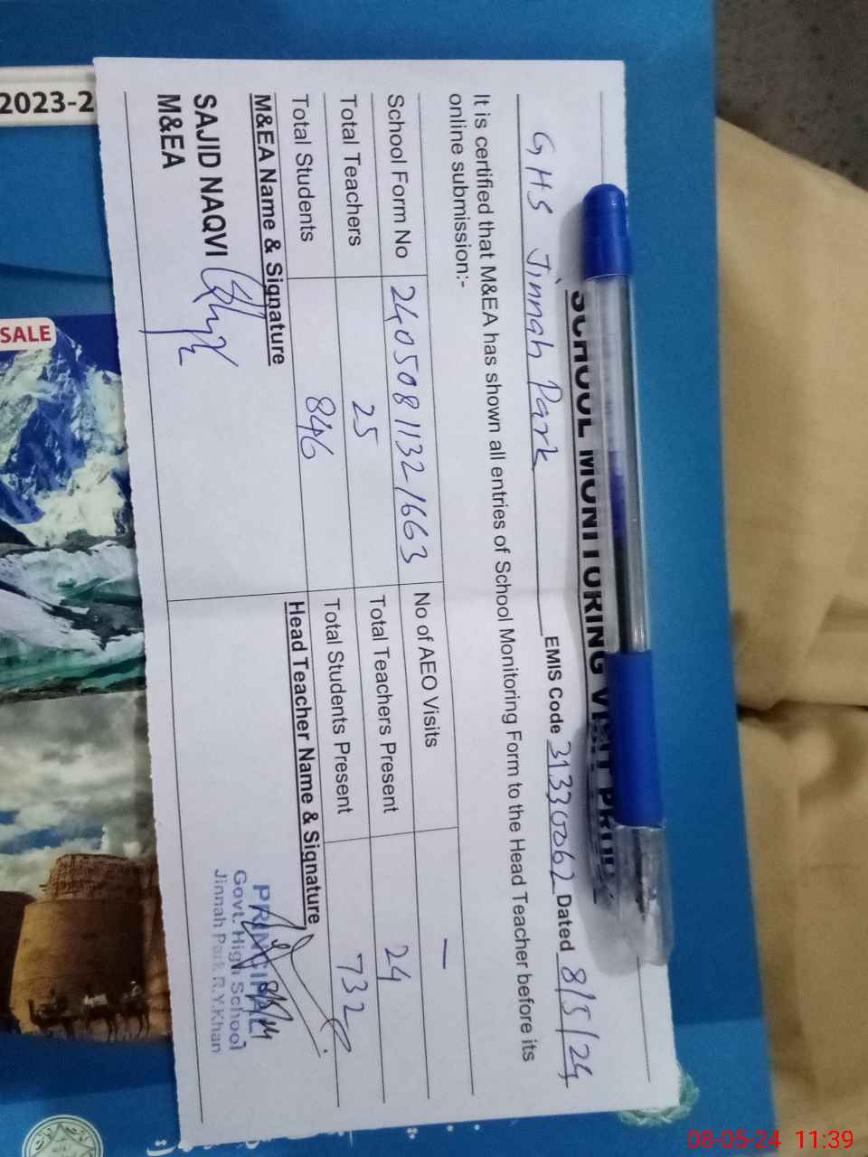 | Certified that this School was Inspected by the Undersigned MEA/DMO Today and the Information Stated Above is as Per Record. | |||||
