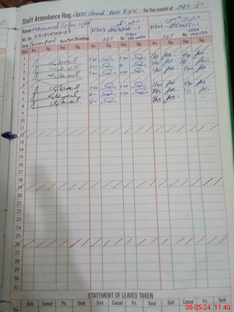 | CNIC | Full Name | Designation | R/C | Absence during last cal. month |