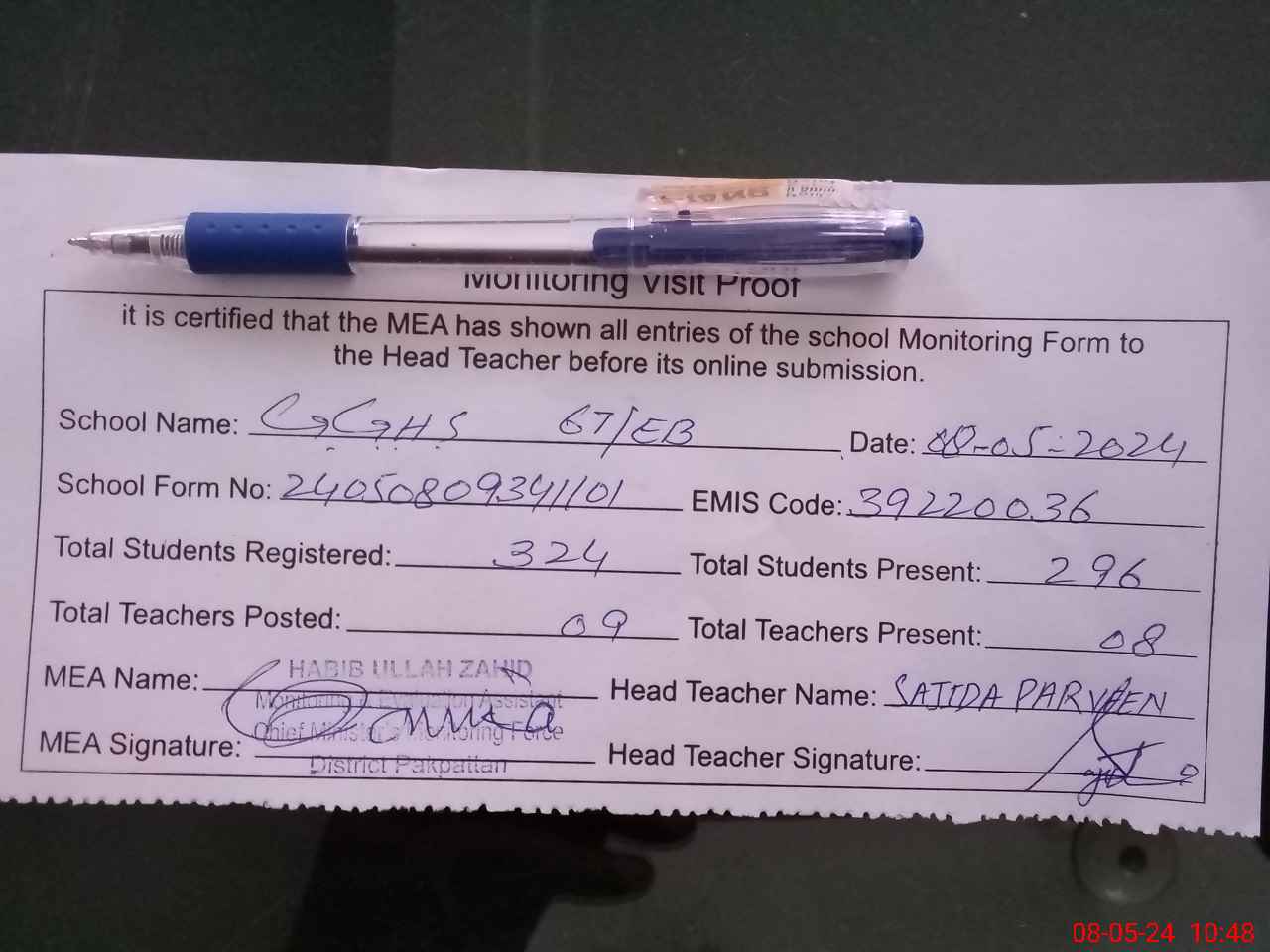 | Certified that this School was Inspected by the Undersigned MEA/DMO Today and the Information Stated Above is as Per Record. | |||||