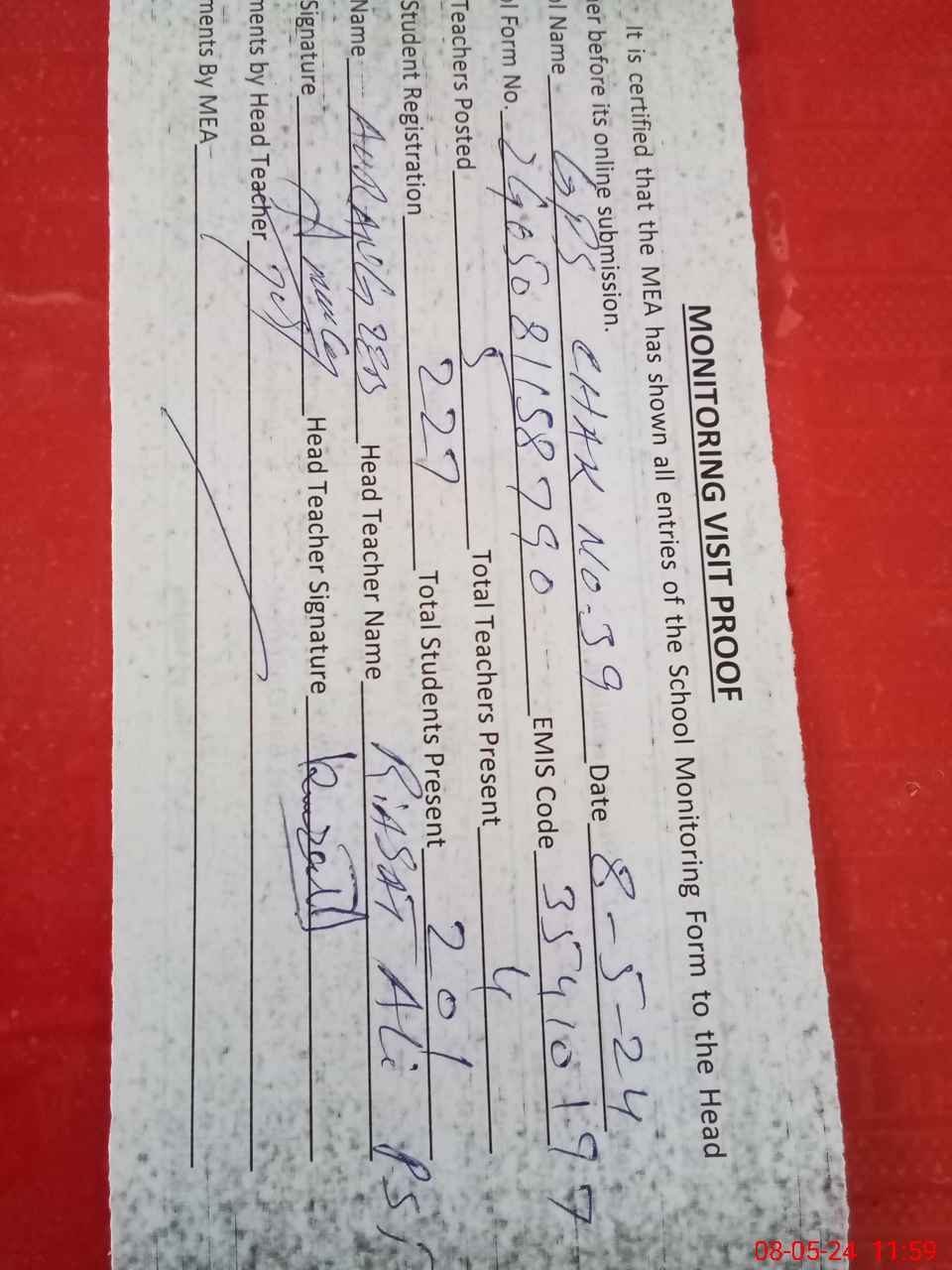 | Attendance Register | Head Teacher | MEA with School | Visit Proof |