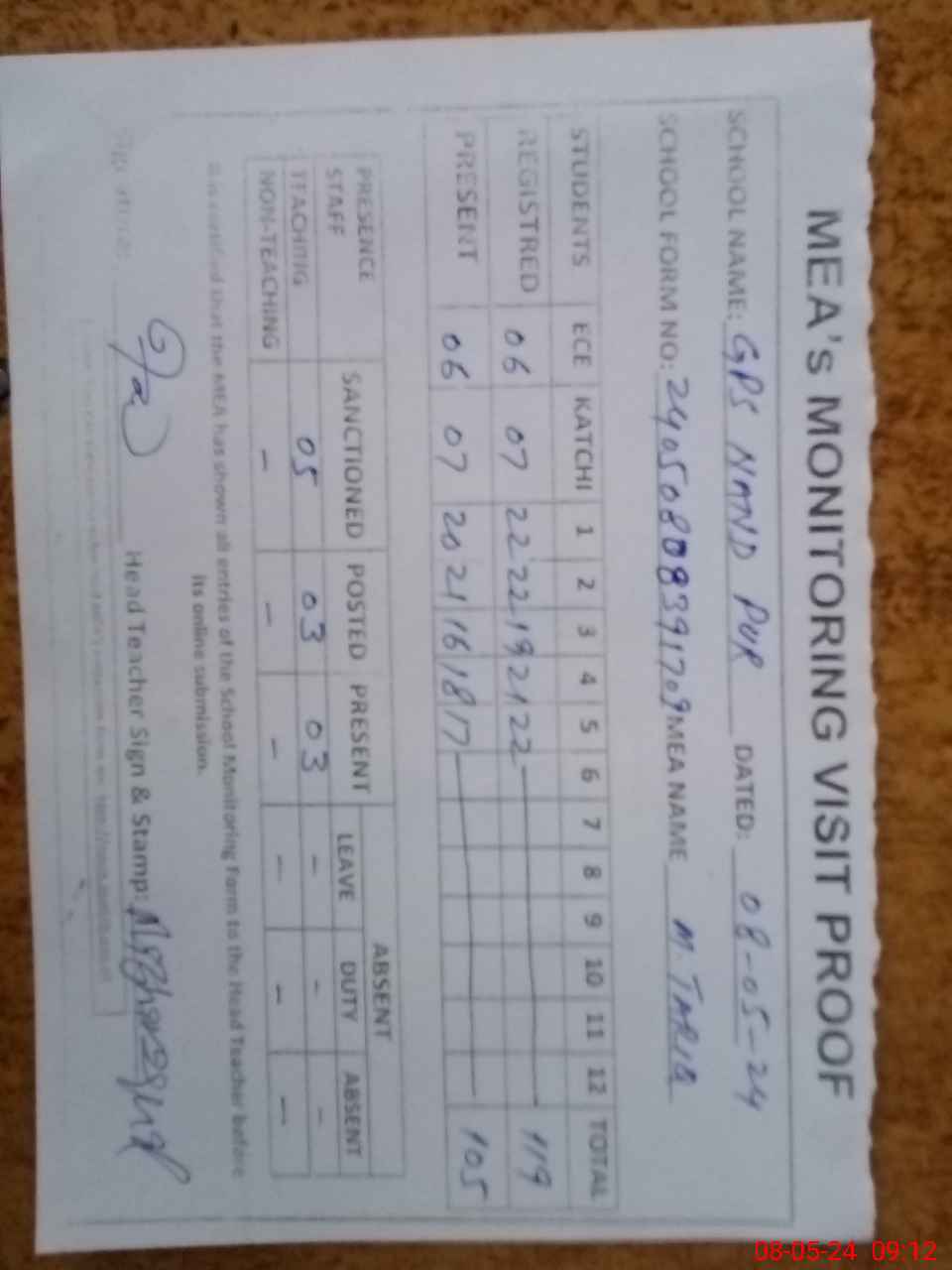 | Attendance Register | Head Teacher | MEA with School | Visit Proof |