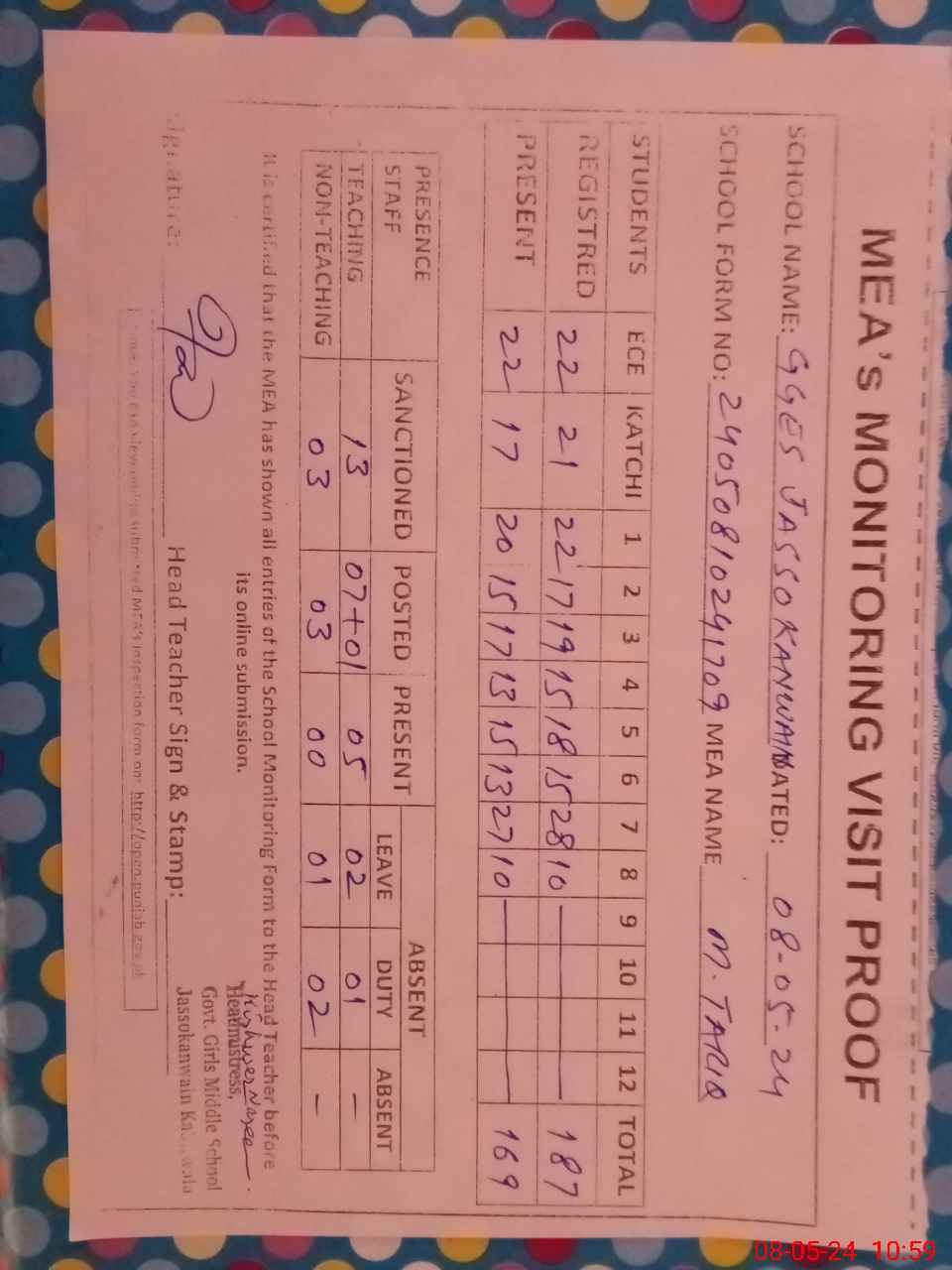 | Attendance Register | Head Teacher | MEA with School | Visit Proof |