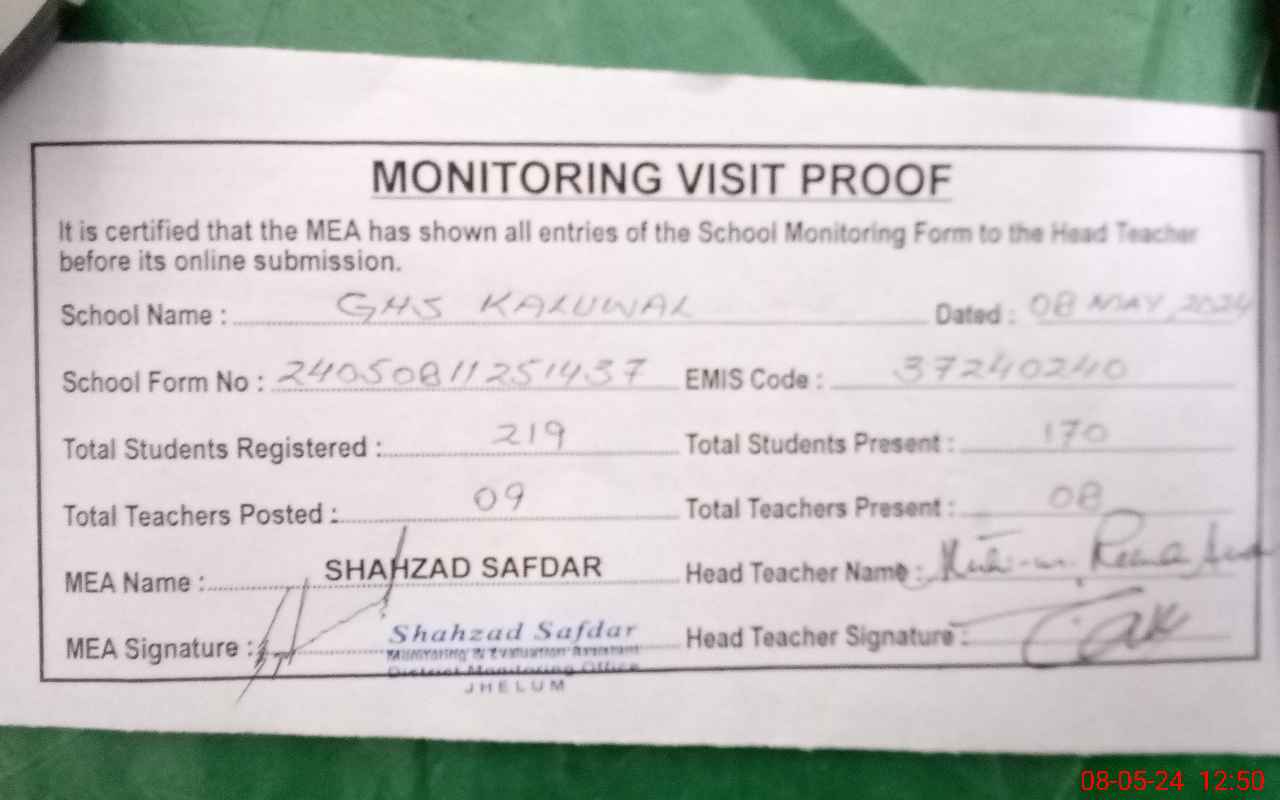 | EMIS Code: 37240240 | Name of School: GHS KALUWAL | |||