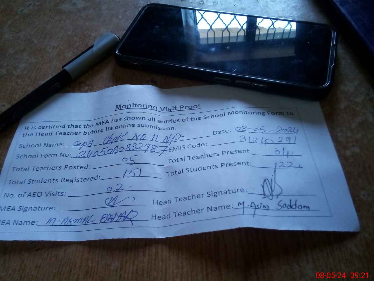 | Name: M.**** Sa**** Designation: (School Headmaster's/Headmistress's) PST Phone/Cell Number: 03**** |