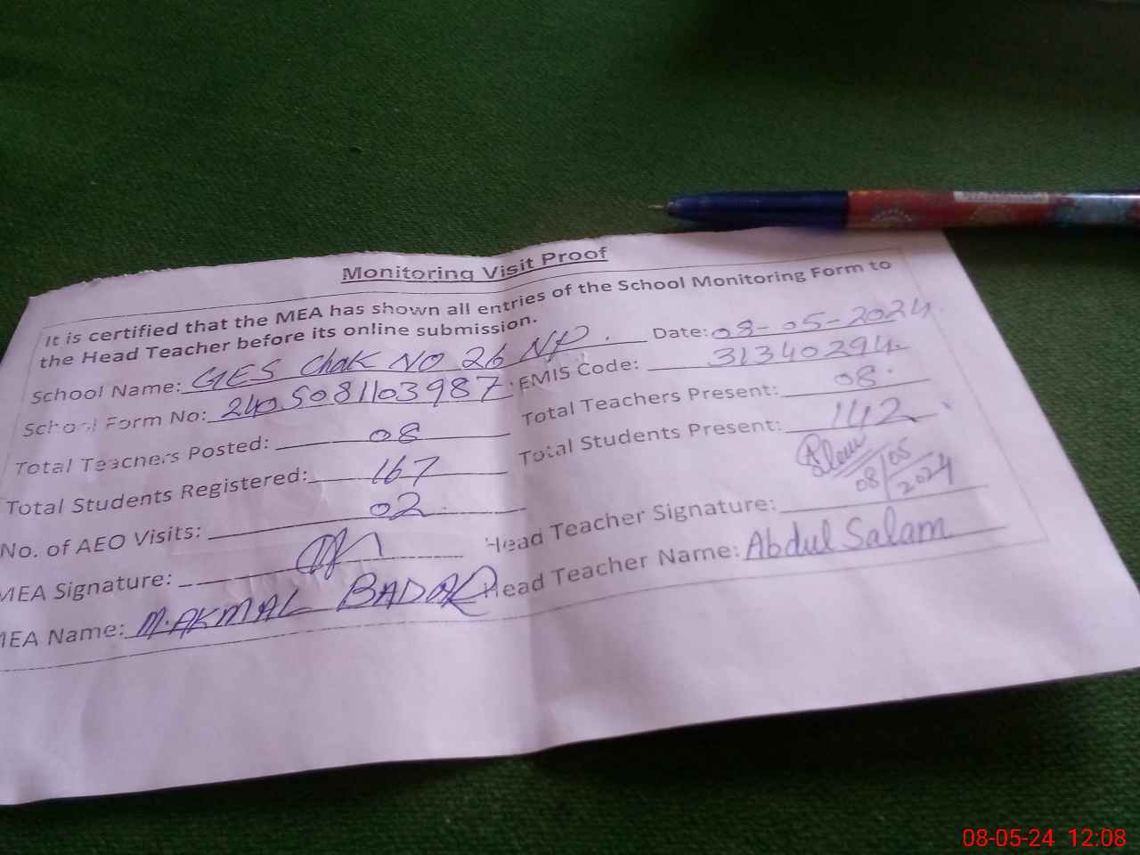 | EMIS Code: 31340294 | Name of School: GES CHAK NO. 26 NP | |||