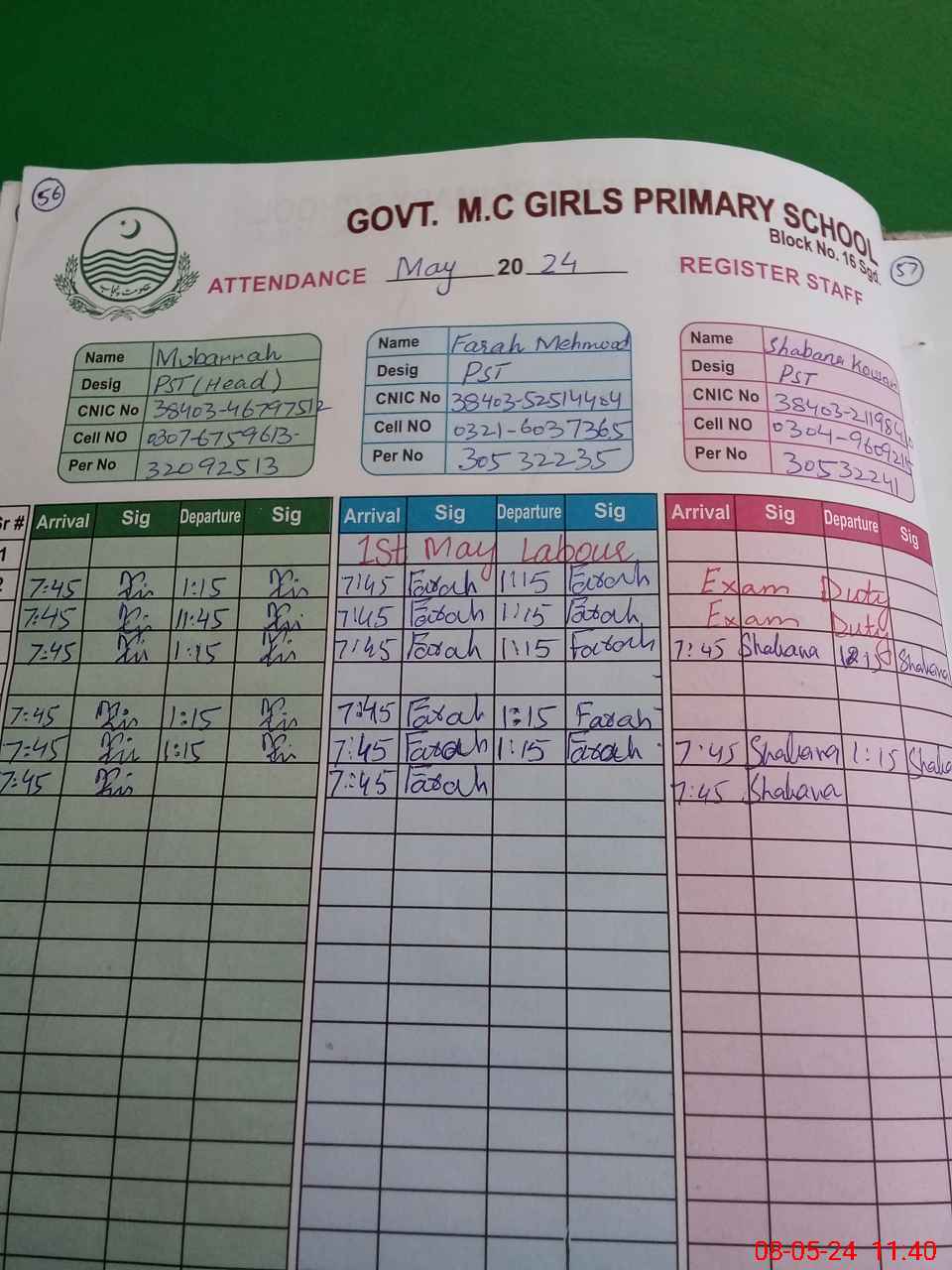 | CNIC | Full Name | Designation | R/C | Absence During Last Calender Month |