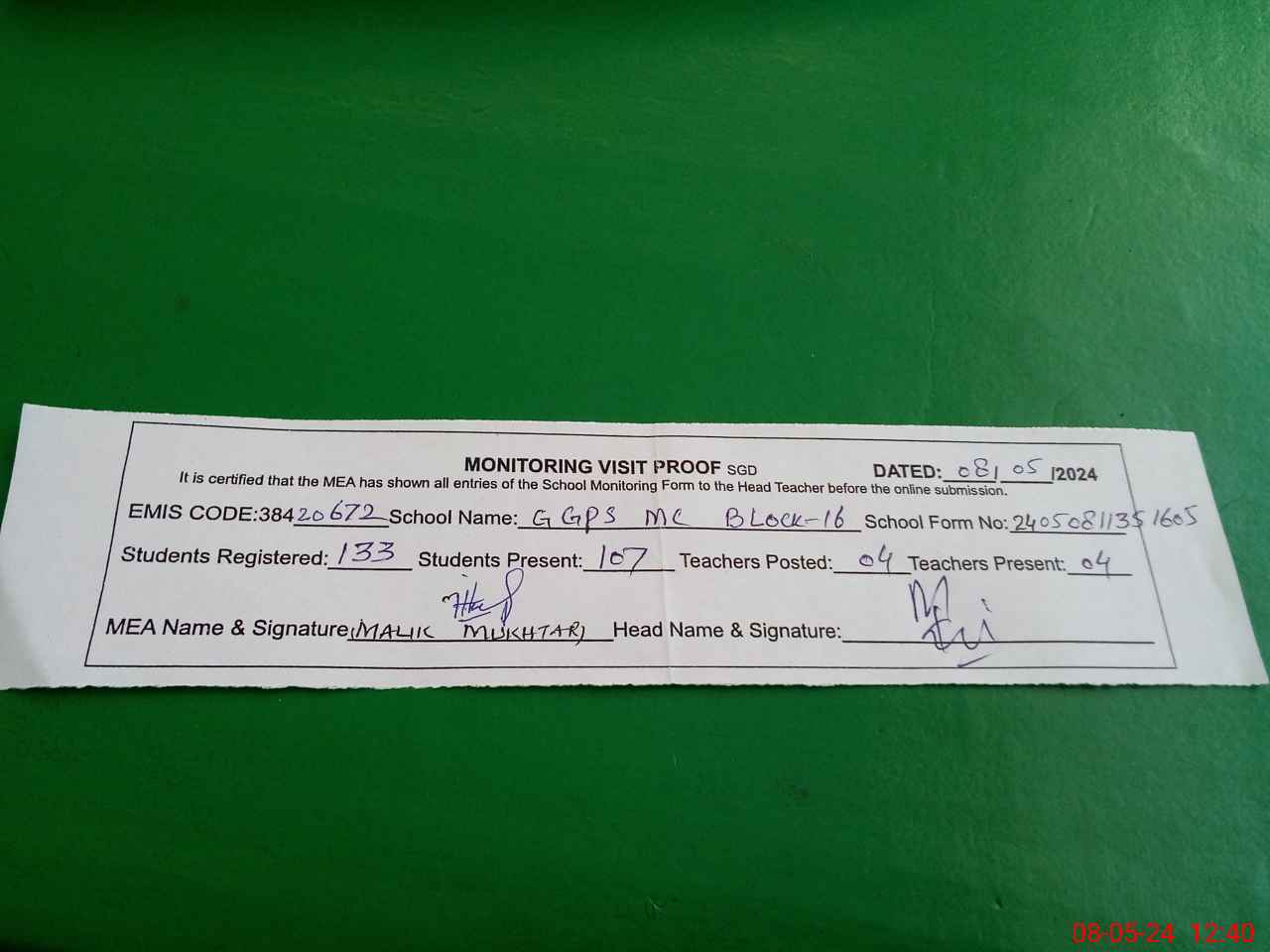 | Attendance Register | Head Teacher | MEA with School | Visit Proof |