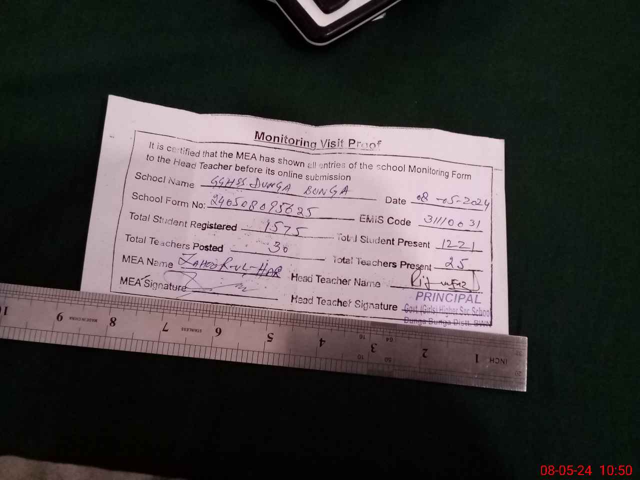 | Certified that this School was Inspected by the Undersigned MEA/DMO Today and the Information Stated Above is as Per Record. | |||||