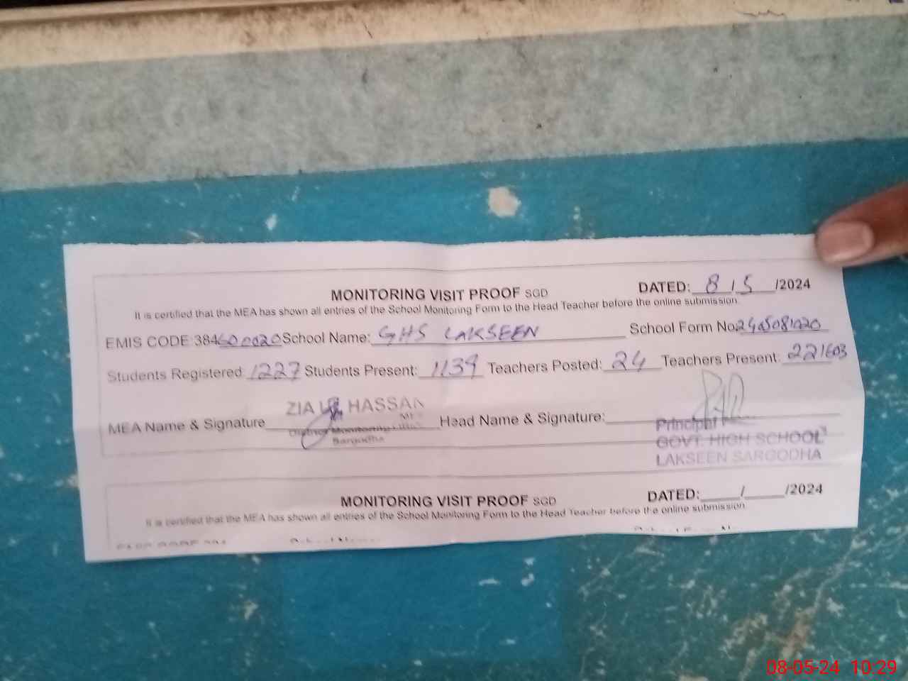 | Monitoring Date: 08-05-2024 | Start Time: 08-05-2024 09:23 AM | End Time: 08-05-2024 10:30 AM | Name of MEA: ZI**** ULHA**** | |