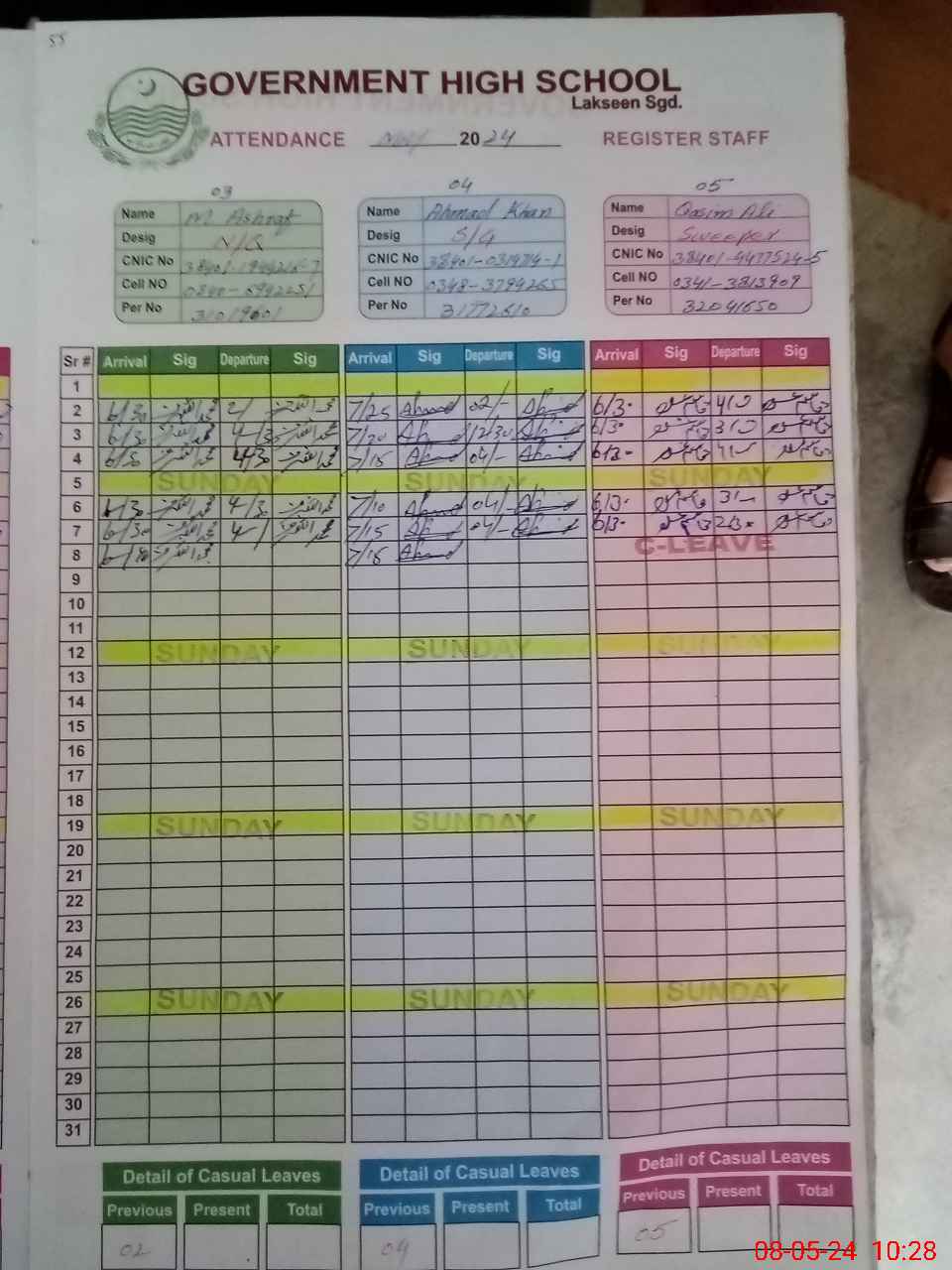 | CNIC | Full Name | Designation | R/C | Absence during last cal. month |