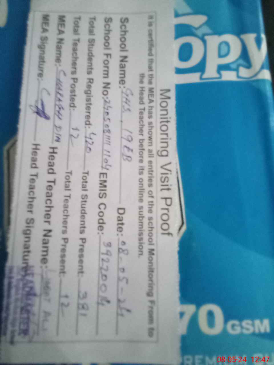 | Attendance Register | Head Teacher | MEA with School | Visit Proof |