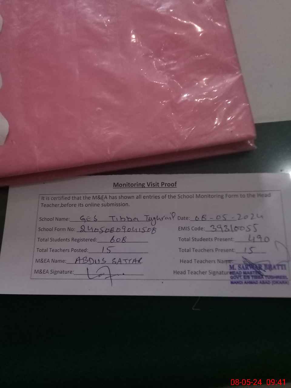| Attendance Register | Head Teacher | MEA with School | Visit Proof |