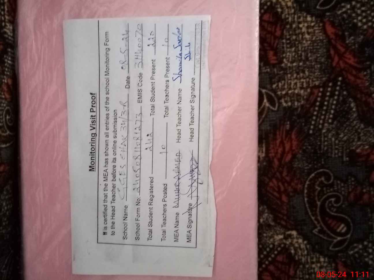 | Attendance Register | Head Teacher | MEA with School | Visit Proof |