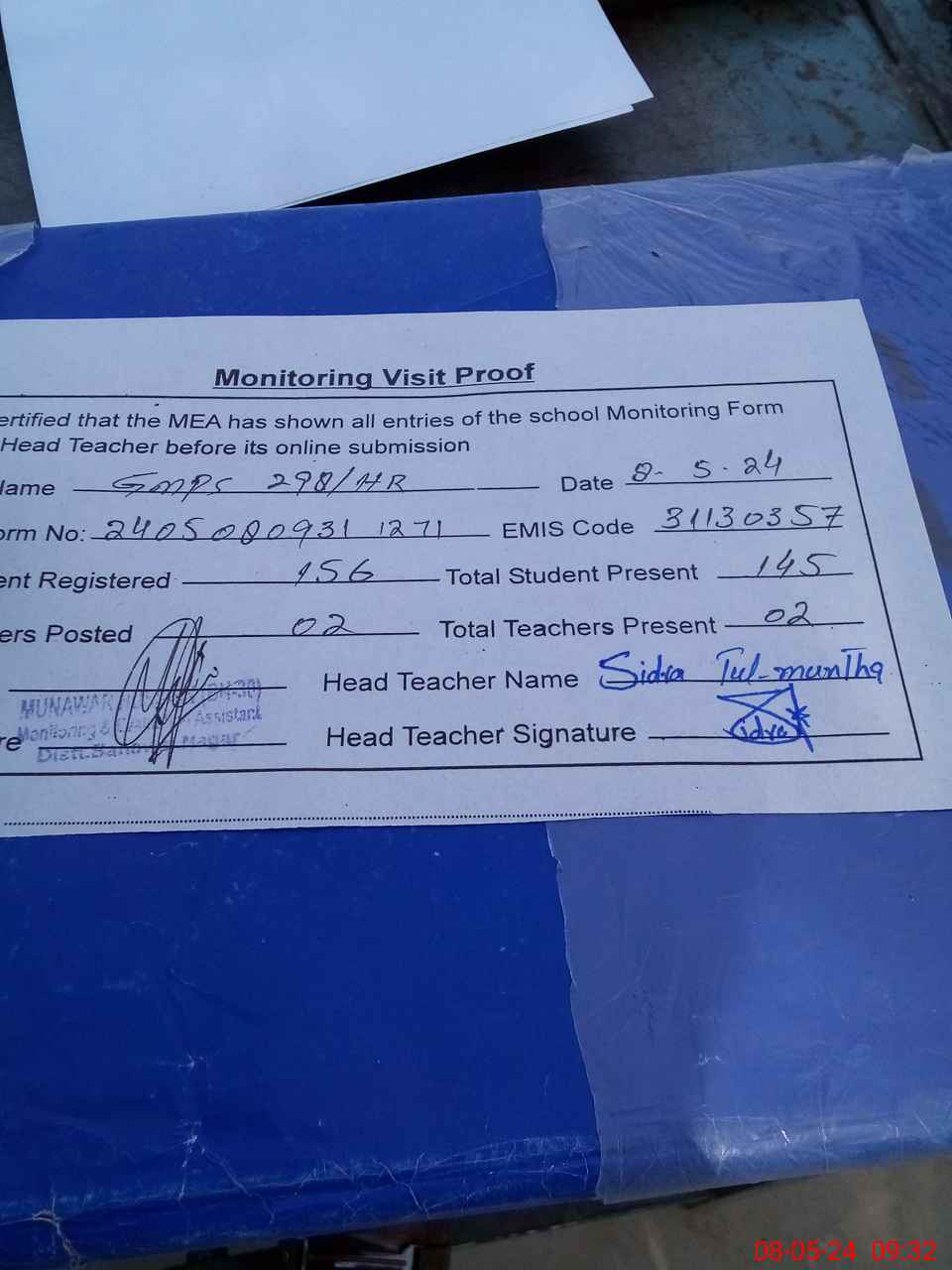 | Attendance Register | Head Teacher | MEA with School | Visit Proof |