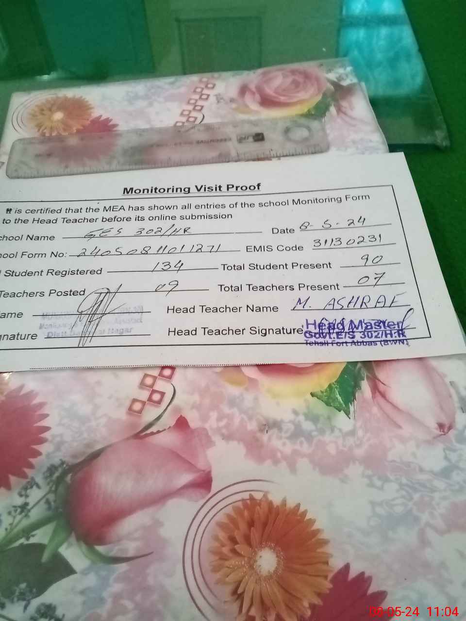 | Attendance Register | Head Teacher | MEA with School | Visit Proof |